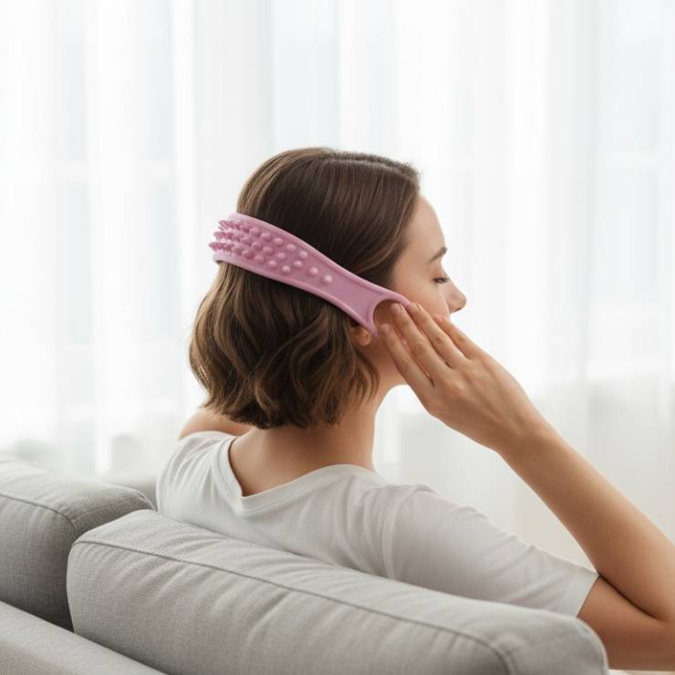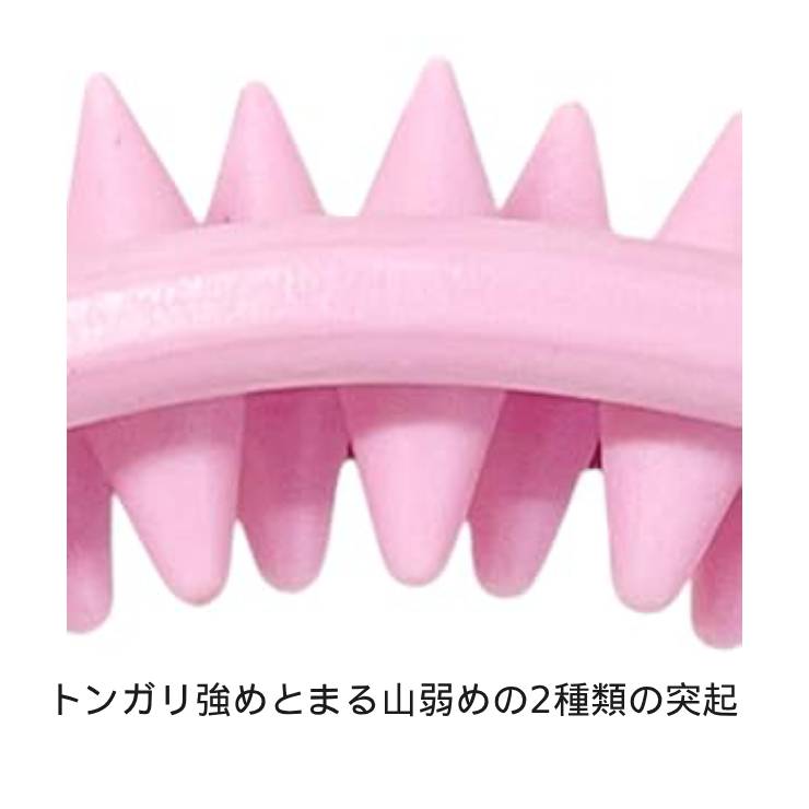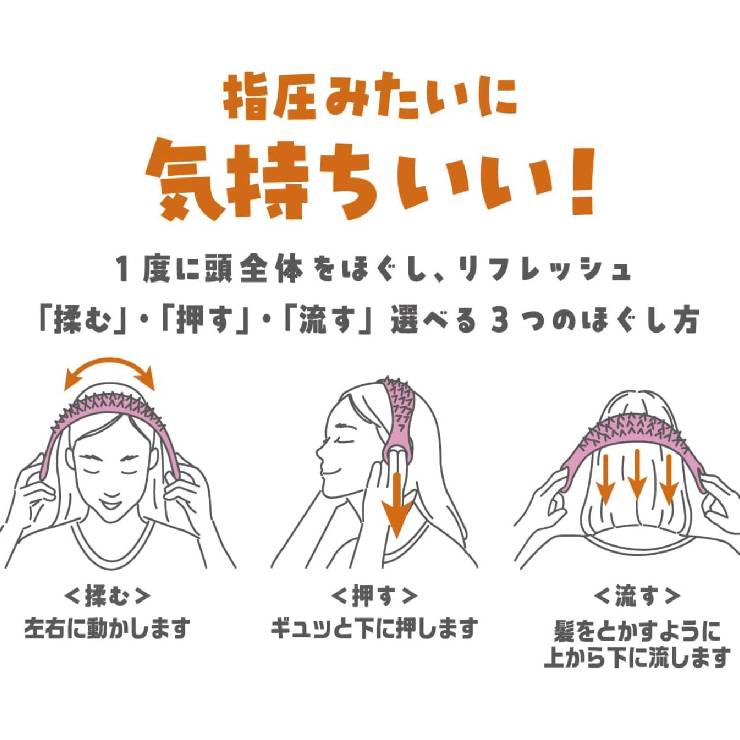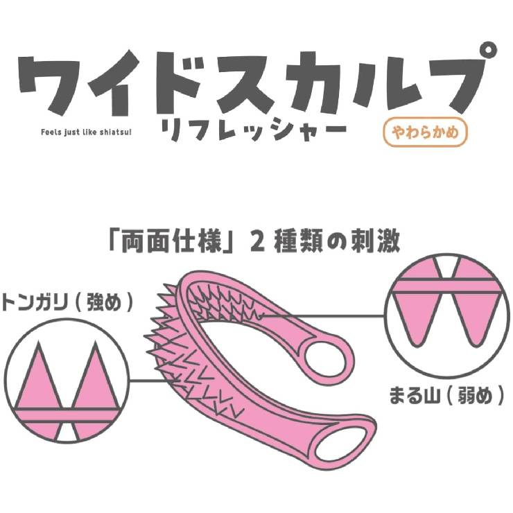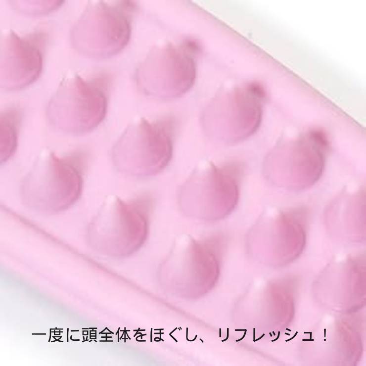 指圧のような感覚を再現する2種類の突起(とんがり強め・まる山弱め)が頭皮に均等な圧を与え、髪をとかすように流すだけで快適なスカルプケアが可能です。