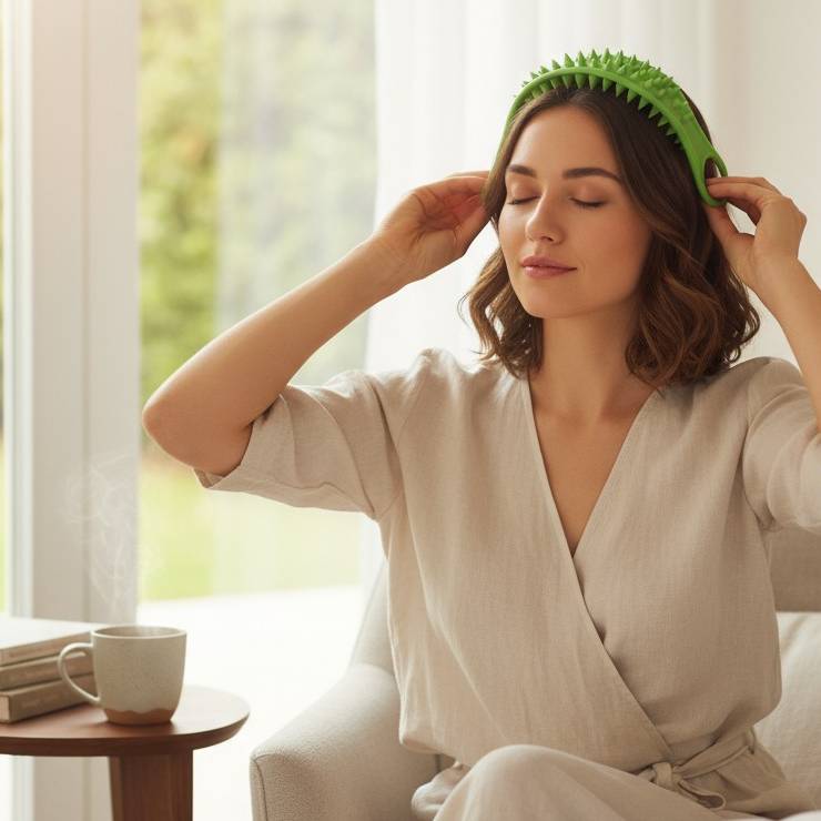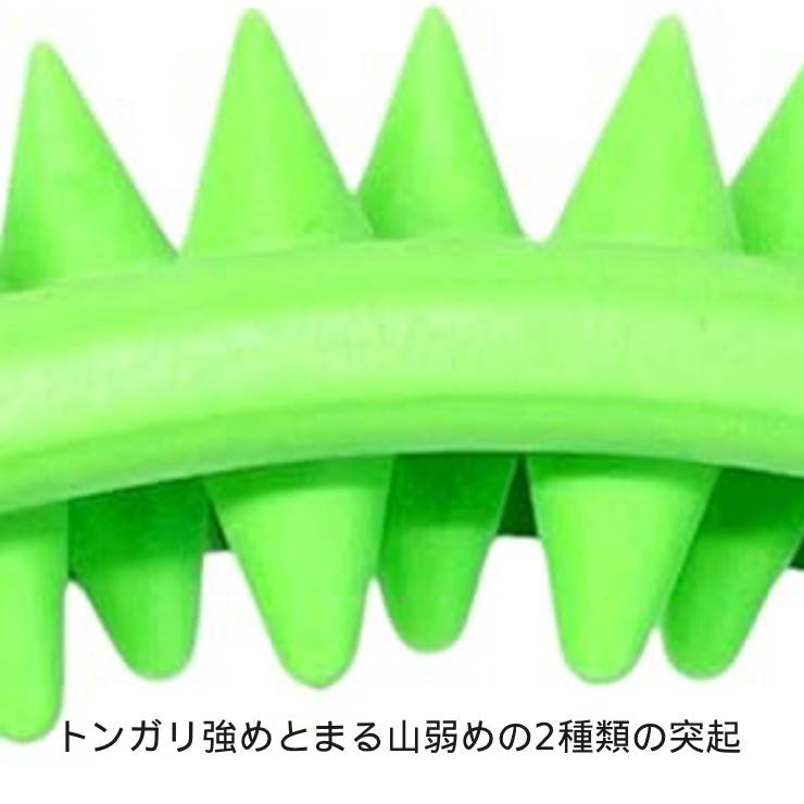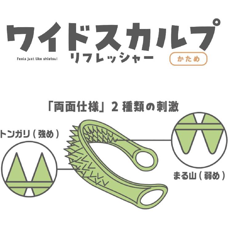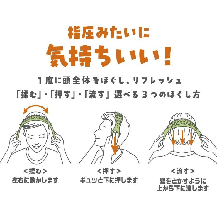 指圧のような感覚を再現する2種類の突起(とんがり強め・まる山弱め)が頭皮に均等な圧を与え、髪をとかすように流すだけで快適なスカルプケアが可能です。