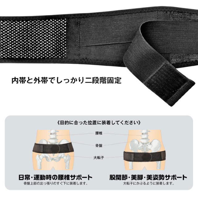 内帯と外帯でしっかり二段階固定する骨盤サポーター。