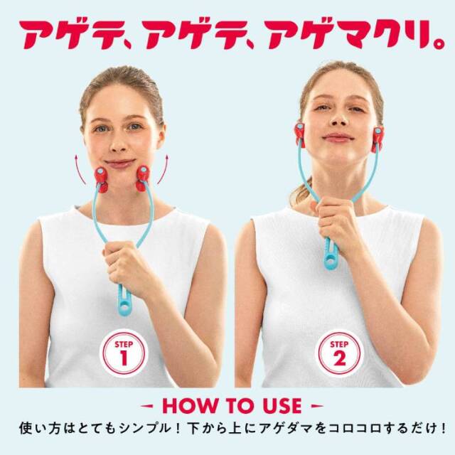 商品を手に持って、ローラーを広げて両頬に挟みます。上下にコロコロ ローリングマッサージ。