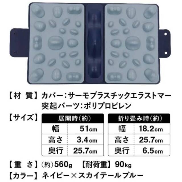 ○サイズは約幅51×奥行25.7×高さ3.4cm、重量は約560g。折りたたむとB5サイズの本型になり、カバンや棚にすっきり収まります。座っても立っても使える耐久設計で、突起は一体成型で取れにくい仕様です。